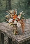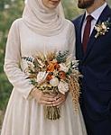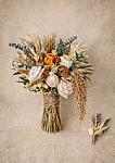 Kiremit, krem ve kahve tonlarının sıcak uyumuyla hazırlanan bu gelin buketi, doğal ve karakterli bir görünüm sunar. Kuru çiçek dokuları, hacimli formlar, yaprak detayları ve yumuşak renk geçişleriyle zenginleştirilen tasarım; bohem, rustik ve sonbahar temalı düğünler için oldukça şık bir tercih oluşturur. Kiremit tonlarının güçlü etkisi bukete canlı ve özgün bir hava katarken, krem çiçekler tasarımı dengeler, kahve ve toprak tonları ise doğal bir derinlik kazandırır.