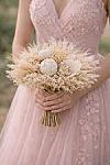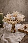 Doğal dokuların sakin ve etkileyici uyumunu yansıtan bu gelin buketi, soft krem ve kırık beyaz tonlarıyla zamansız bir zarafet sunar. Kuru çiçekler, ince dallı dokular, başak detayları ve hacim kazandıran doğal formlar bir araya gelerek sade ama güçlü bir görünüm oluşturur. Özellikle bohem, rustik, vintage ve minimal düğün konseptleri için son derece uyumlu olan bu tasarım, klasik buket anlayışından farklı olarak daha karakterli ve özgün bir stil ortaya koyar.