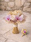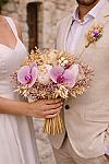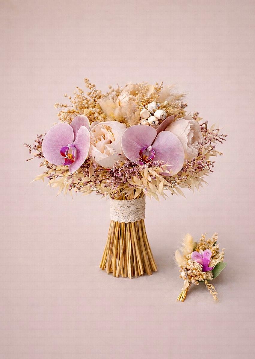 Doğal tonların sıcaklığı ile orkidenin asil duruşunu bir araya getiren bu tasarım, düğün günü stilinize farklı ve unutulmaz bir dokunuş kazandırır. Özellikle bohem, rustik, modern romantik ve özel konsept düğünlerde öne çıkan bu gelin buketi, zarif görünümünün yanında sanatsal ve seçkin bir hava da taşır. Hem gelin buketi hem de damat yaka çiçeği ile uyumlu bir bütünlük sunarak çiftin stilini tamamlayan şık bir detay haline gelir.