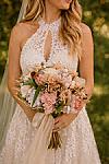 Doğal bağlama detayı ve akışkan kurdele dokunuşuyla tamamlanan bu tasarım, düğün gününde stilini romantik ama seçkin bir detayla güçlendirmek isteyen gelinler için ideal bir tercihtir. Somon lale ve krem gala çiçeği el buketi, zarafeti, doğallığı ve yumuşak renk uyumunu bir arada sunarak unutulmaz bir gelin görünümünün en özel tamamlayıcılarından biri olur.